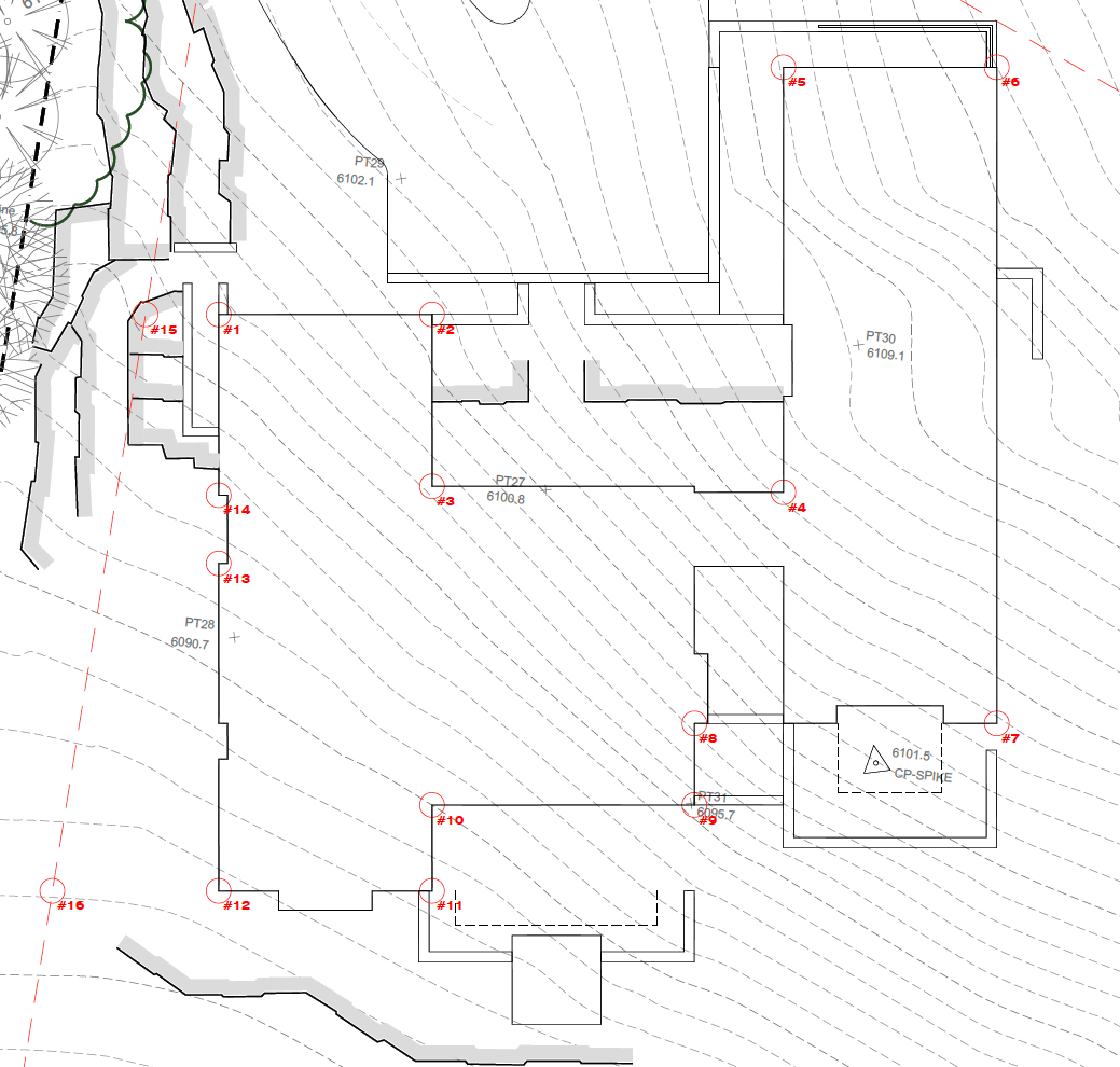 his fall, we had Galena Engineering provide stakes on the property to show where elements of the design would appear on the property. The stakes show where various edges of the proposed building would sit, including the dining room, living room, deck, entry, garage, and more. It is a very insightful way to understand how the structure can exist on this property. A downloadable PDF is below: